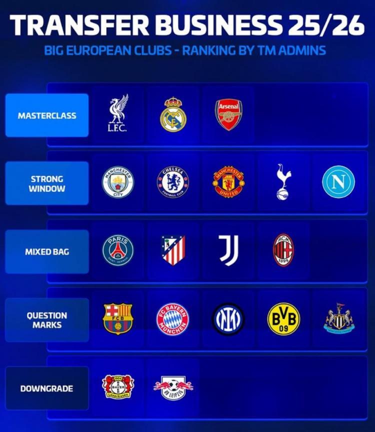 直播吧9月6日讯 主流联赛夏季转会窗已经结束,《转会市场》也为今夏多家欧洲俱乐部的转会操作进行了评级:
